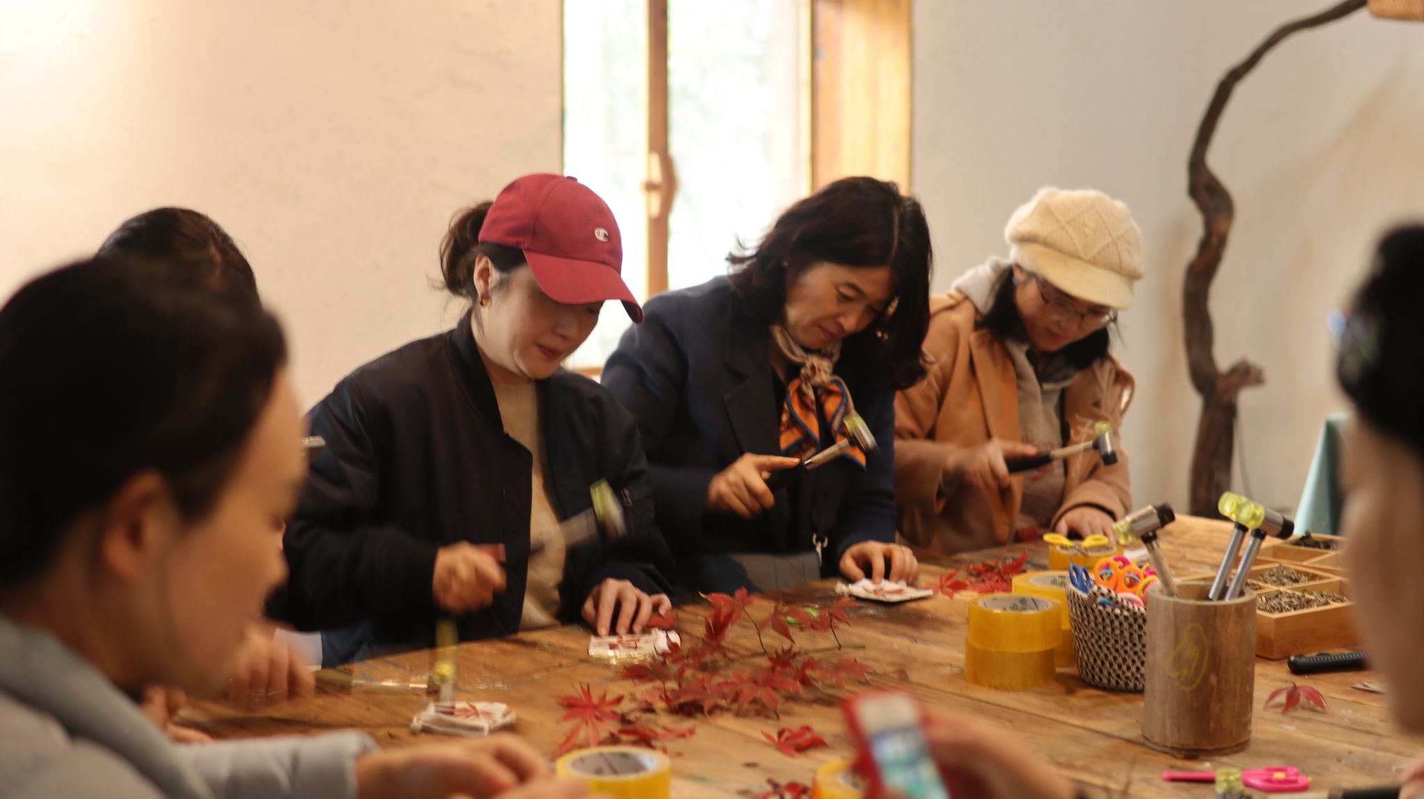 “疏影横斜水清浅,暗香浮动月黄昏”,拾一片花草,固色、布局、敲打,将花草的汁液浸润在布袋上,留下大自然最原始的香气、纹理与色彩。植物拓染不仅创造着大自然的生态环境美学,也书写着传统非遗技艺独特魅力。
